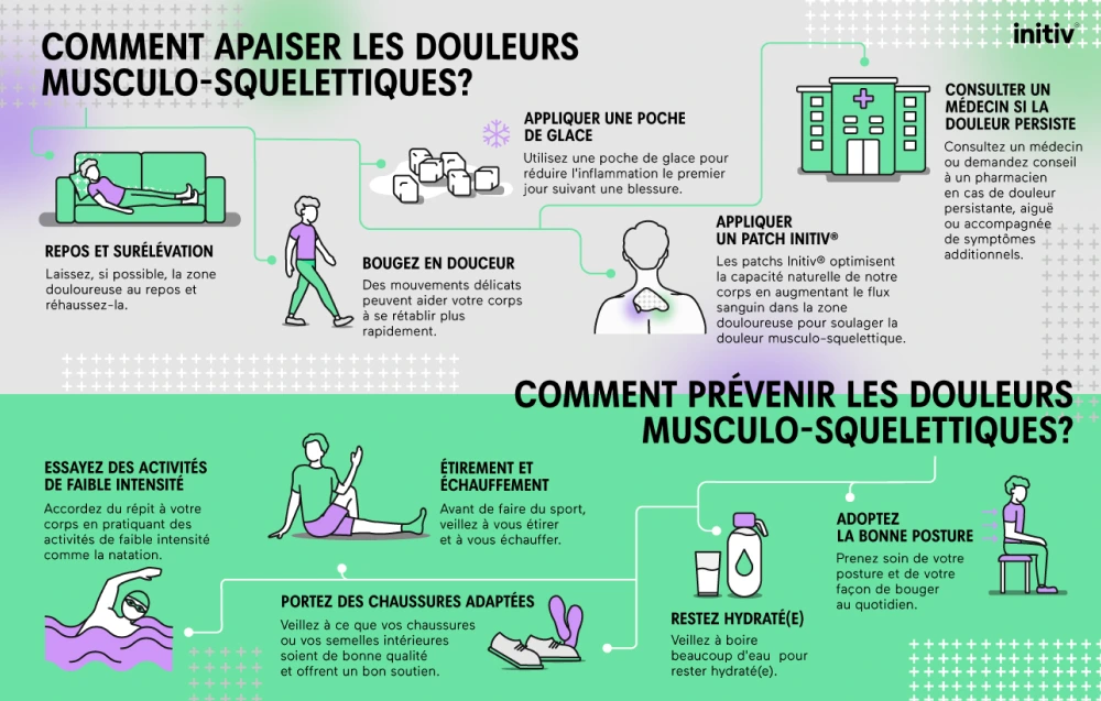 Du repos, de la glace et une surélévation sont des méthodes saines et fiables pour soigner des muscles douloureux sans traitement.17 Cependant, nous avons parfois besoin d’un petit coup de pouce pour soulager les douleurs. Les patchs initiv® optimisent la capacité naturelle de notre corps à soulager la douleur.26 Les particules minérales de ce dispositif médical reflètent l'énergie infrarouge émise par le corps et la redirigent vers la zone de la douleur. L'énergie infrarouge permet d'augmenter la circulation sanguine pour soulager les douleurs musculaires faibles a modérées jusqu'à 5 jours, sans actif médicamenteux.