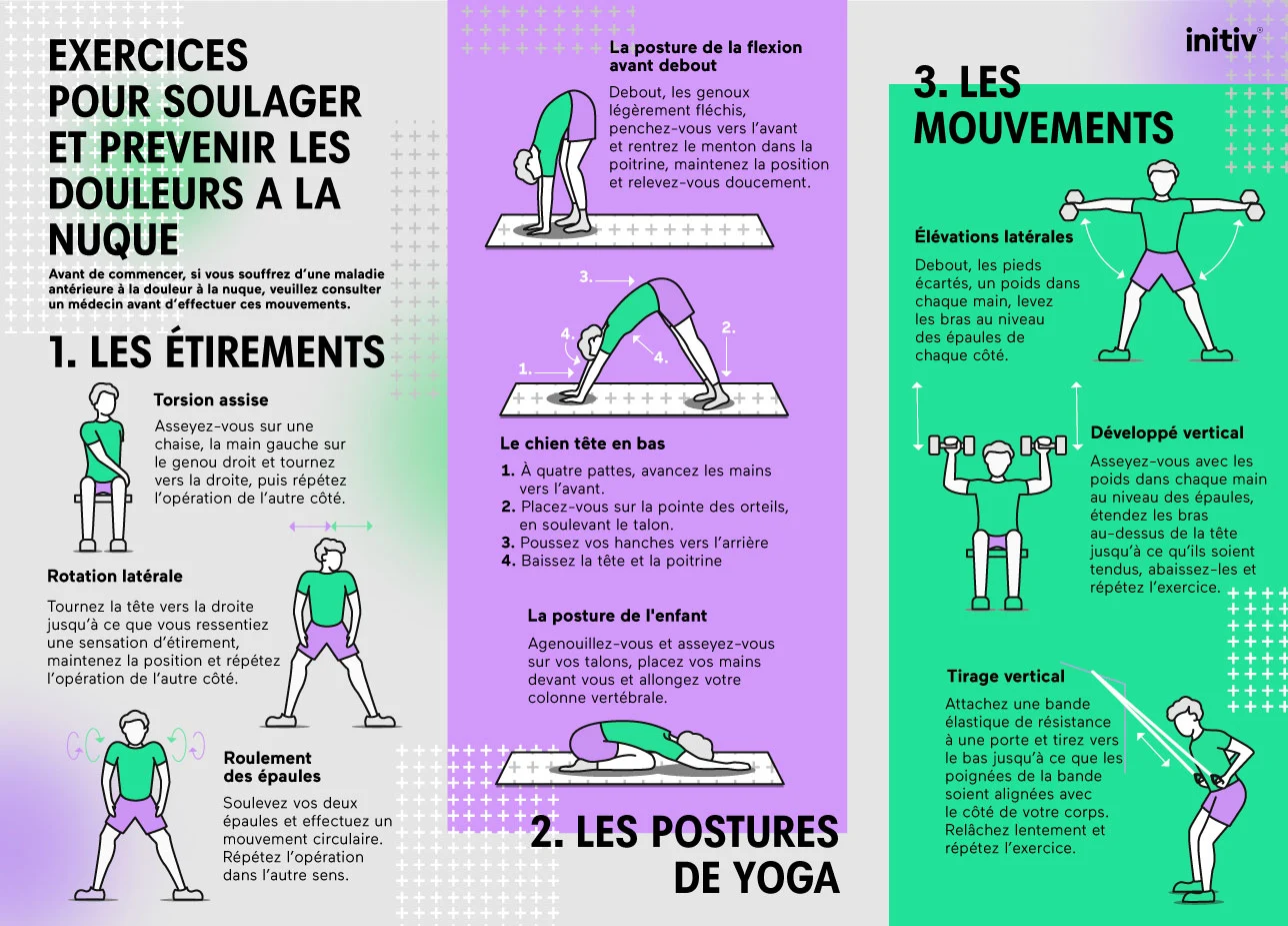 Cela dépend de la cause de votre douleur cervicale, mais en cas de douleur musculosquelettique aiguë (courte durée) au niveau de la nuque vous pouvez essayer des étirements, des exercices et même des postures de yoga pour aider à détendre et à renforcer les muscles tendus. En complément, vous pouvez appliquer un patch initiv® sur la zone concernée pour soulager la douleur jusqu'à 5 jours.