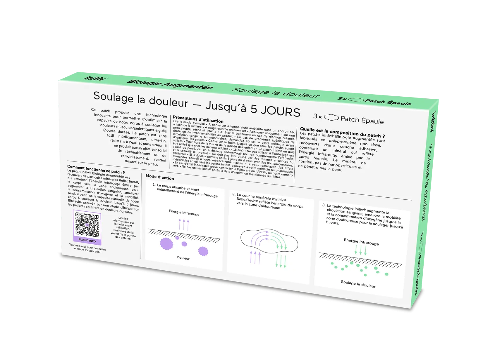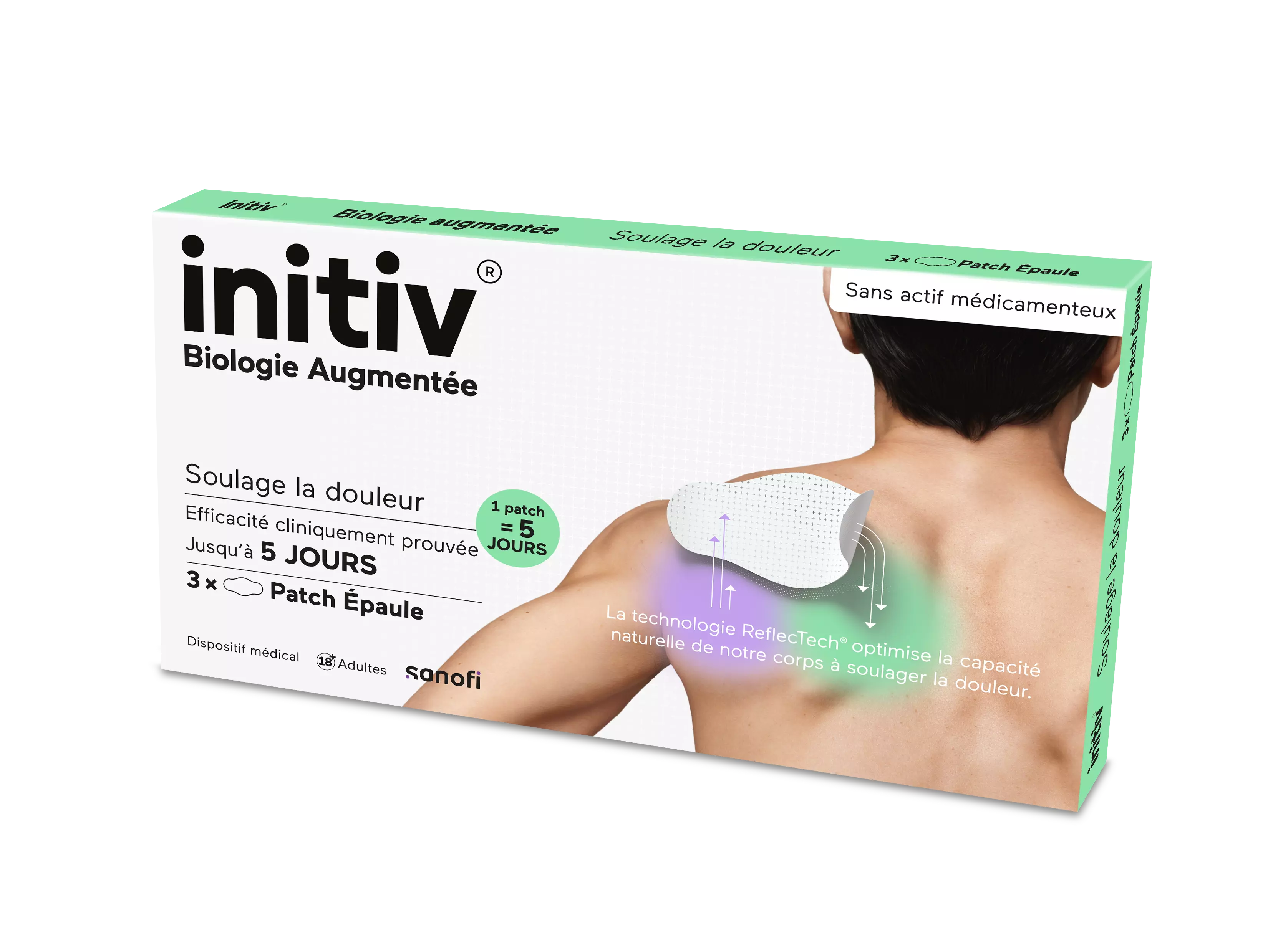 Initiv® est un patch pour l’épaule sans actif médicamenteux, ultrafin, résistant à l'eau et sans odeur, conçu contre les douleurs de musculo-squelettiques (touchant les articulations, les muscles et les tendons) au niveau l’épaule de l'adulte. Grâce à la technologie ReflecTech®, le patch initiv® pour l’épaule réfléchit l'énergie infrarouge émise naturellement par le corps vers la zone douloureuse pour soulager les douleurs musculosquelettiques aiguës (courte durée) jusqu'à cinq jours. Initiv est un dispositif médical.